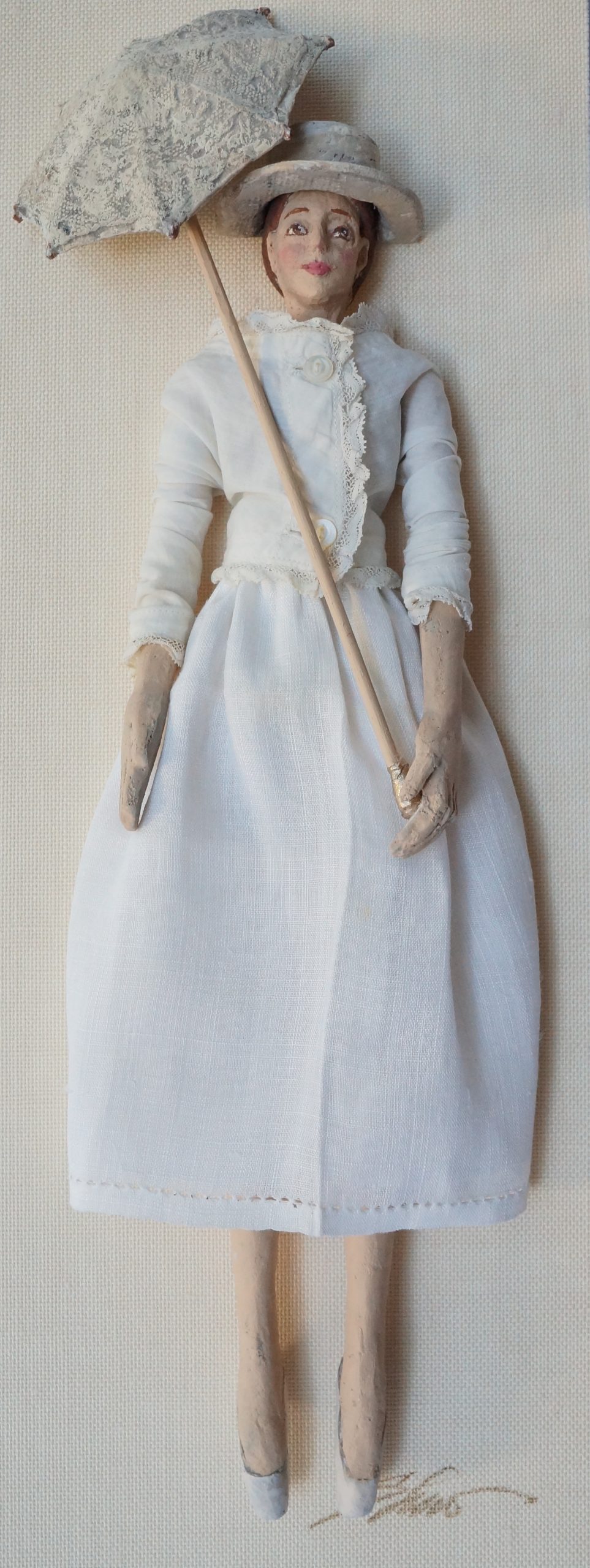 Paper sculpture handmade artwork by Betty Shew, featuring hand-cast paper in the shape of a woman in white old-fashioned clothing, wearing a hat and carrying an umbrella. The woman’s jacket and skirt are sewn from vintage fabric.
