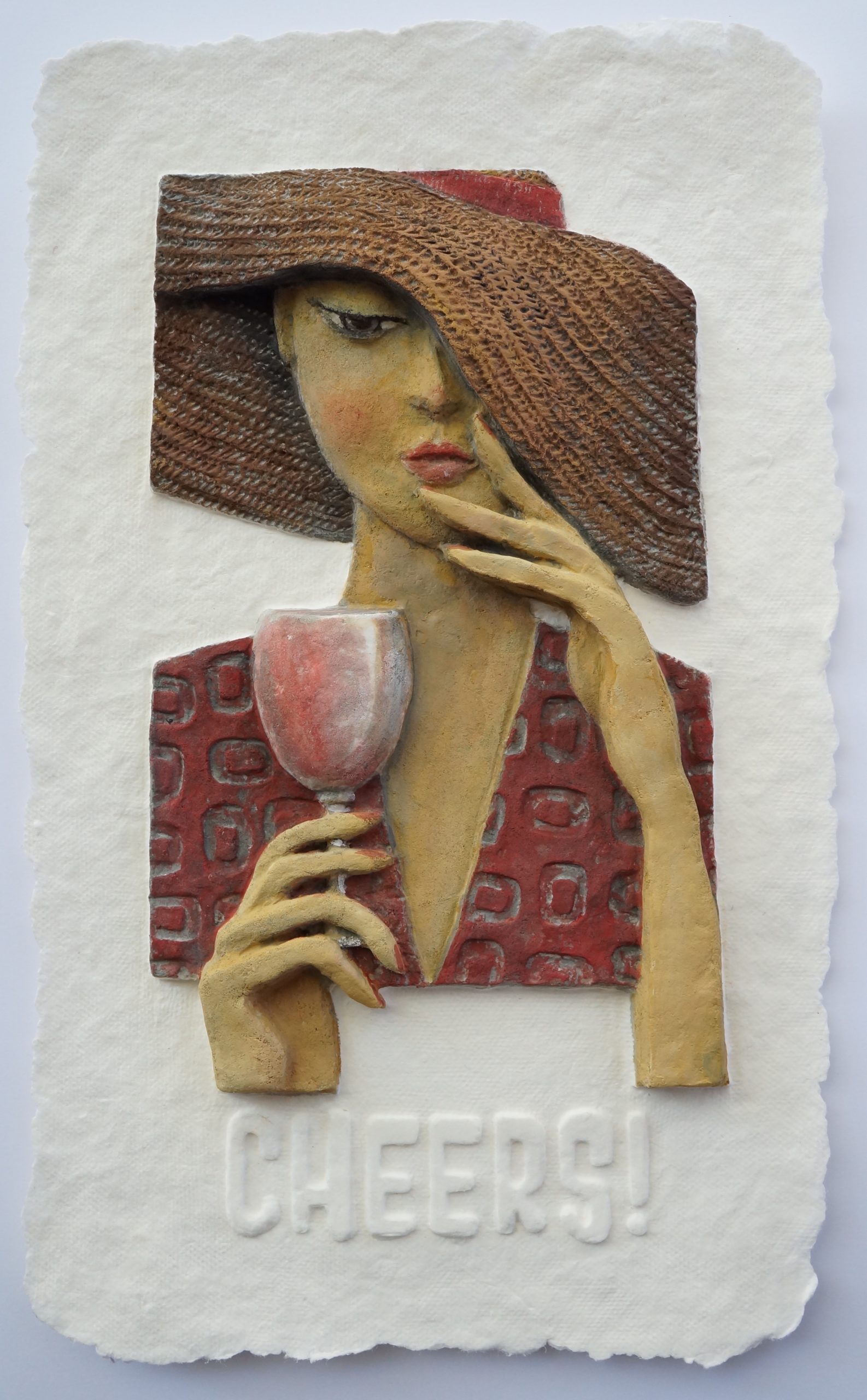 Paper sculpture handmade artwork by Betty Shew, featuring hand-cast paper with a mid-century modern styled female wearing a floppy hat, holding a wine glass and the word Cheers! underneath, colored with acrylic paint.
