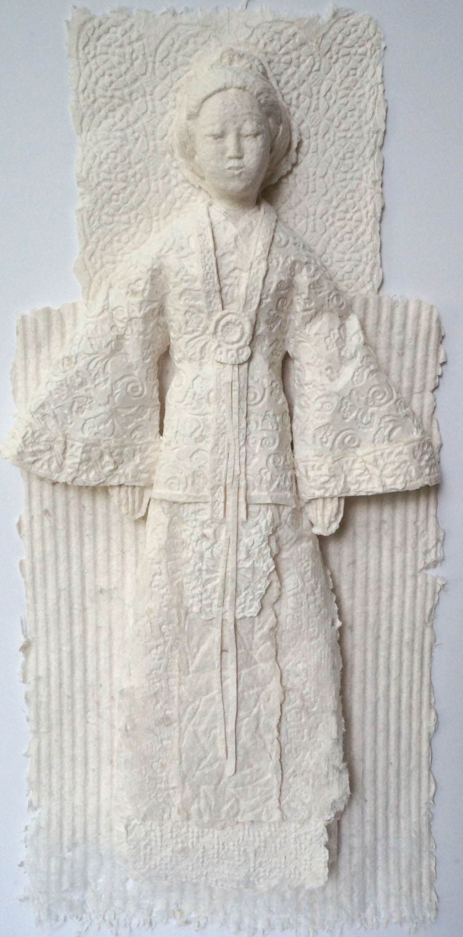 Paper sculpture handmade artwork by Betty Shew, featuring hand-cast paper featuring an Asian princess wearing a ceremonial robe. Natural paper color.