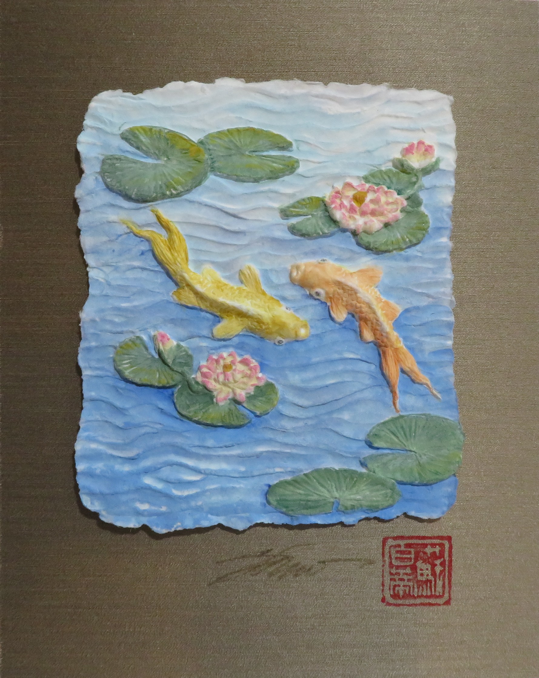 Paper sculpture handmade artwork by Betty Shew, featuring a scene of two koi fish swimming among lily pads and flowers, painted with acrylic. The paper sculpture is attached to a fabric background with the artist’s name at the bottom and a stamp showing the artist’s chop.