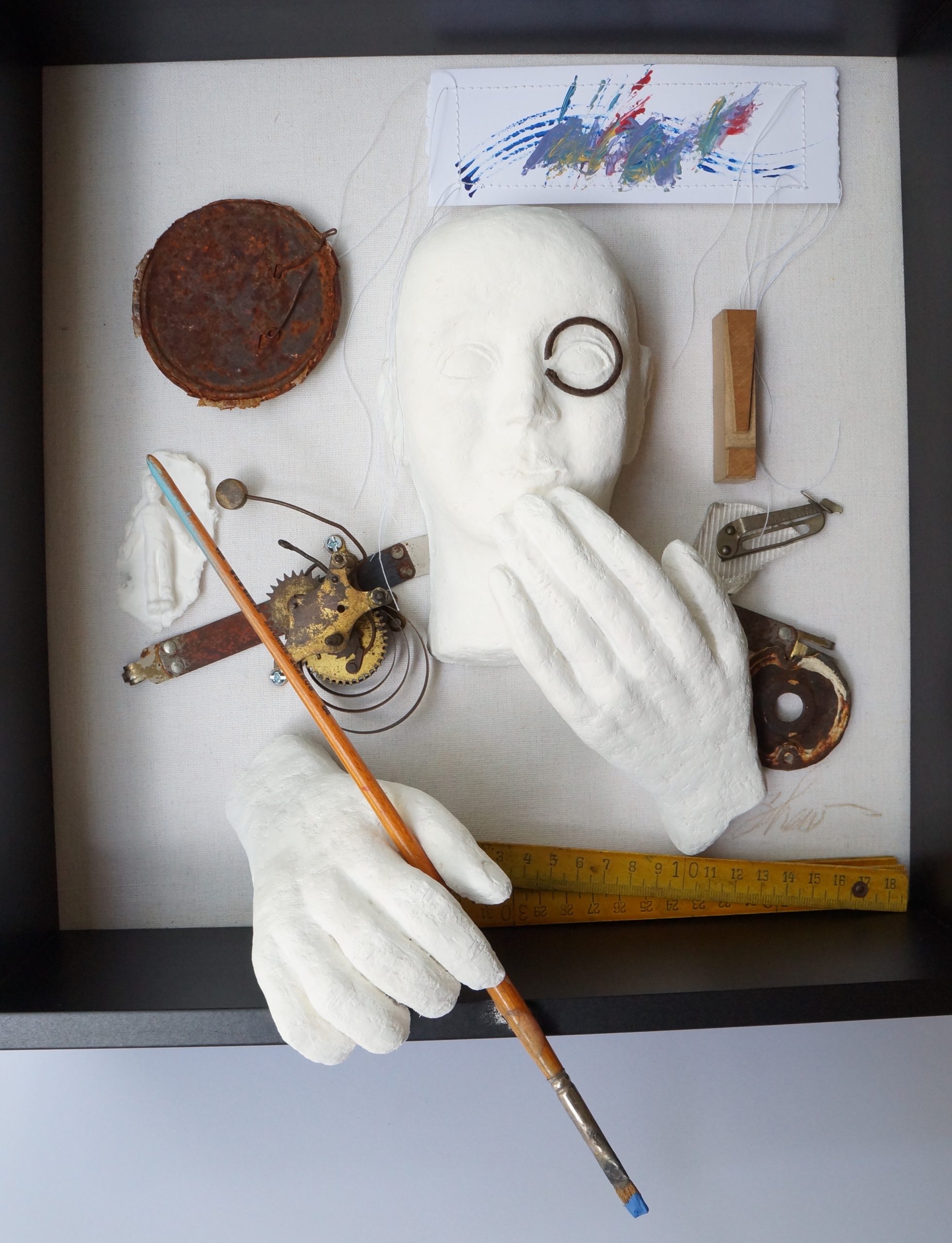 Paper sculpture handmade artwork by Betty Shew, featuring the bust of a human face, wearing a monocle, surrounded by found objects and accented by abstract art painted in acrylic. One of the artist’s hands is on the chin, the other hand reaches out of the shadow-boxed art toward the viewer, holding a paint-splattered brush.