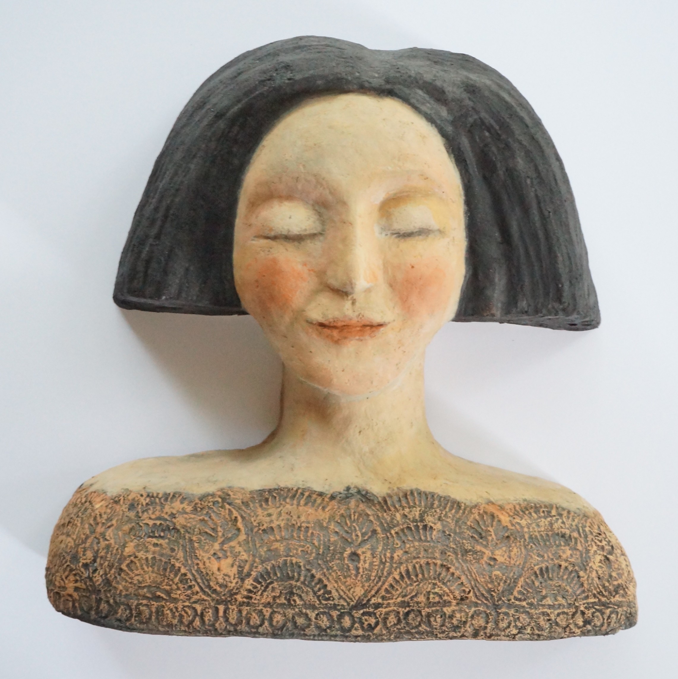 Paper sculpture handmade artwork by Betty Shew, featuring the bust of a woman with angular dark hair, eyes closed with a peaceful expression on her face, wearing a bateau-neck lace shirt, painted in acrylic.